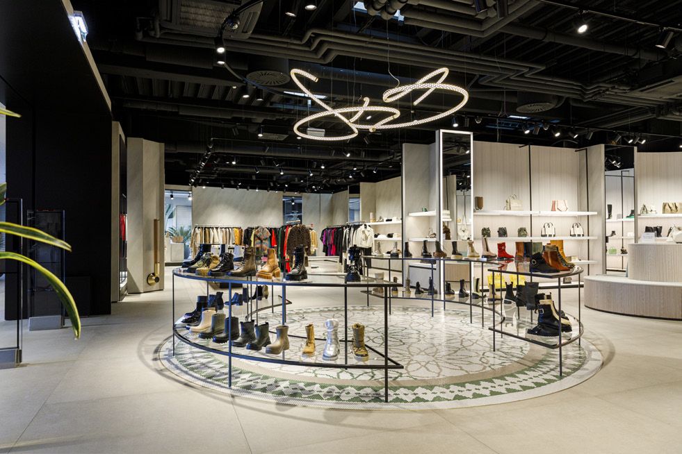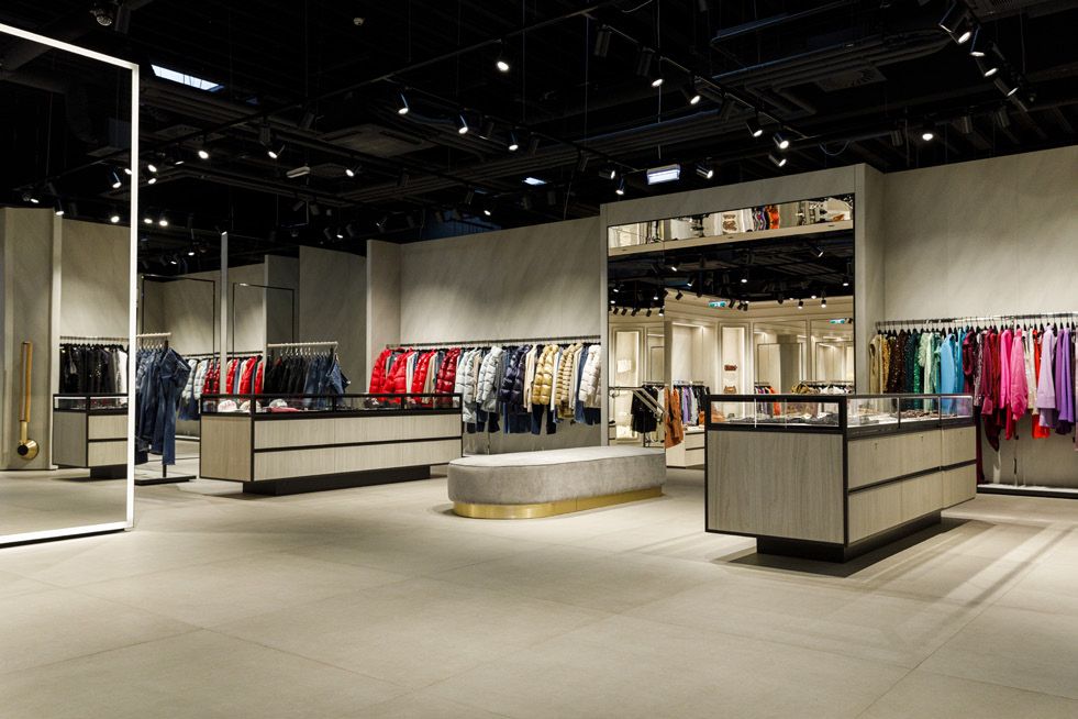 Legno scuro vengo, intonaco effetto cemento, Metallo nero opaco, tessuto velvet in tonalità petrolio per le corner lounge centrali