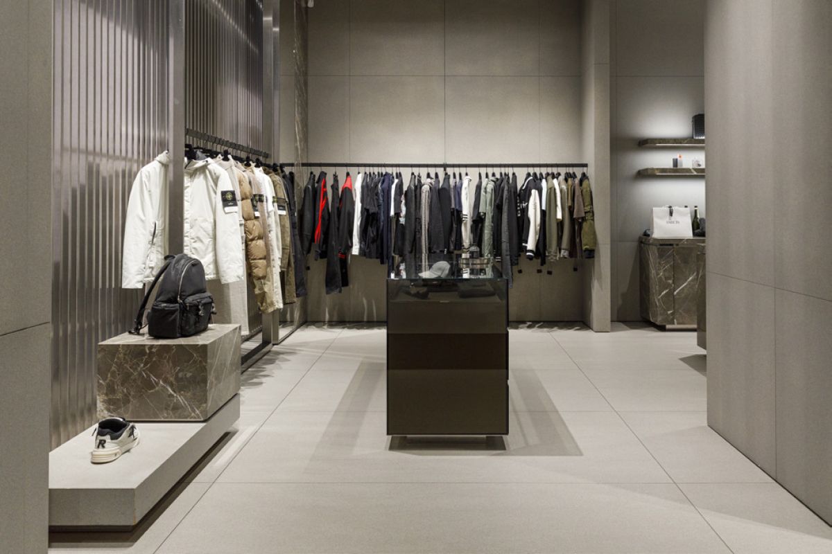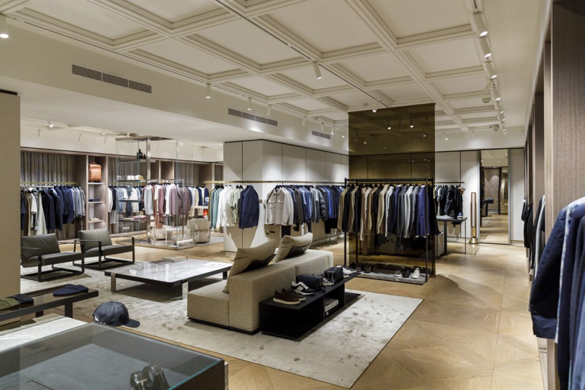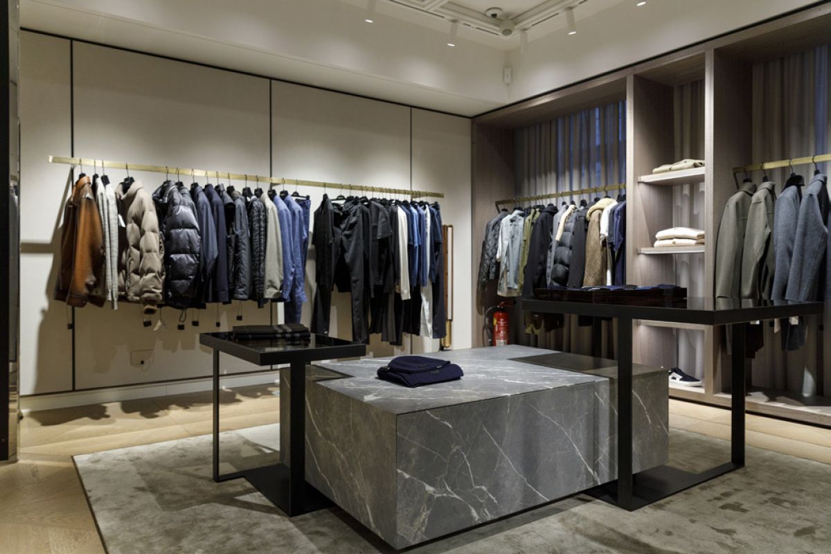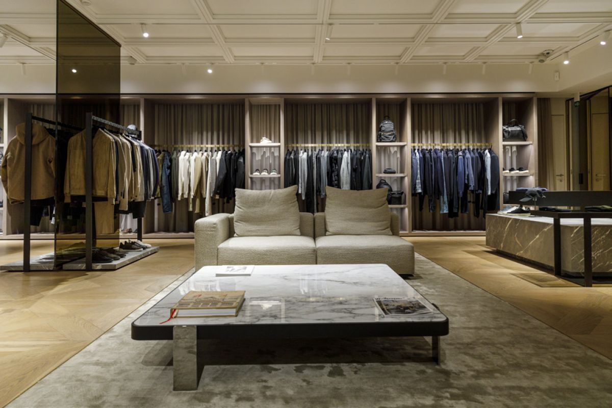 Legno scuro vengo, intonaco effetto cemento, Metallo nero opaco, tessuto velvet in tonalità petrolio per le corner lounge centrali