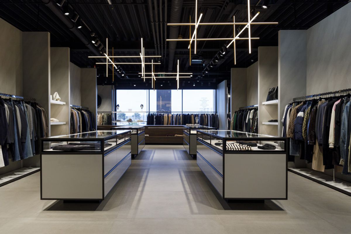 Legno scuro vengo, intonaco effetto cemento, Metallo nero opaco, tessuto velvet in tonalità petrolio per le corner lounge centrali