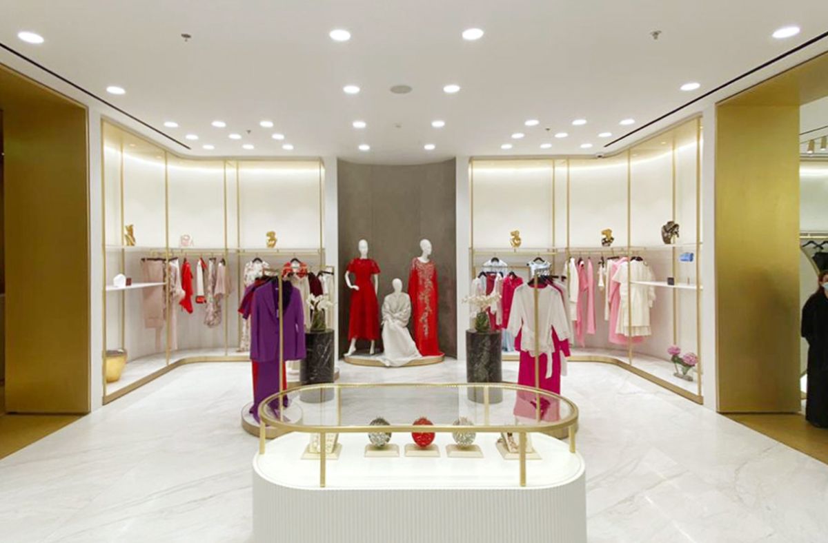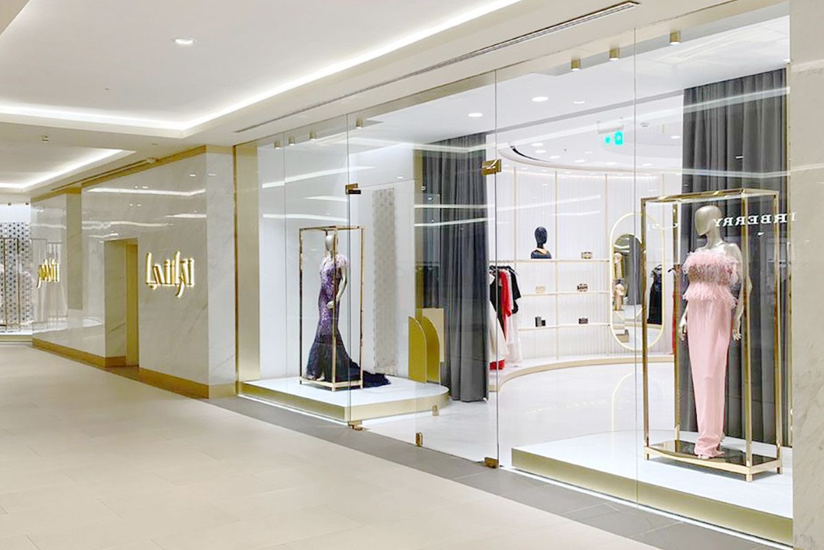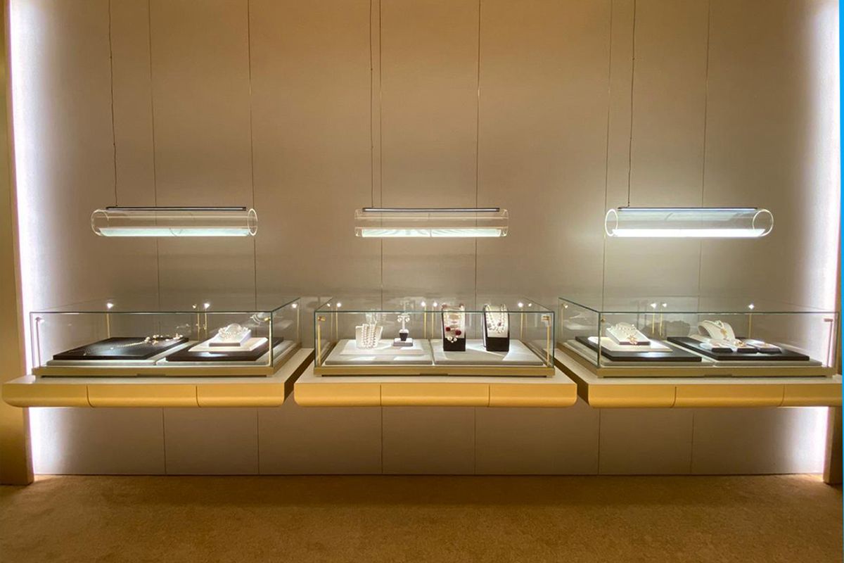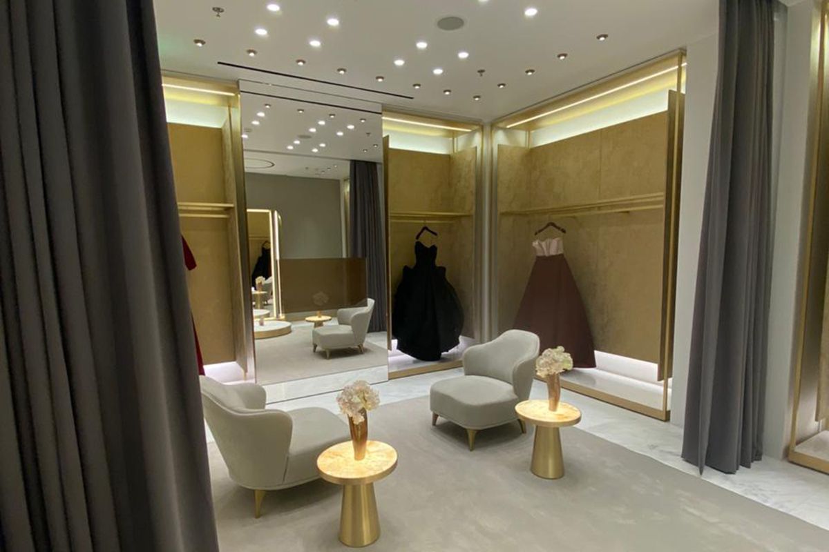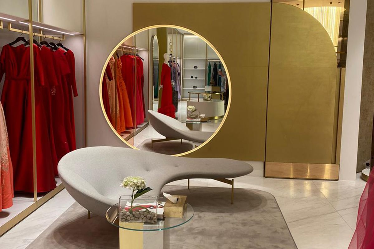 Legno scuro vengo, intonaco effetto cemento, Metallo nero opaco, tessuto velvet in tonalità petrolio per le corner lounge centrali