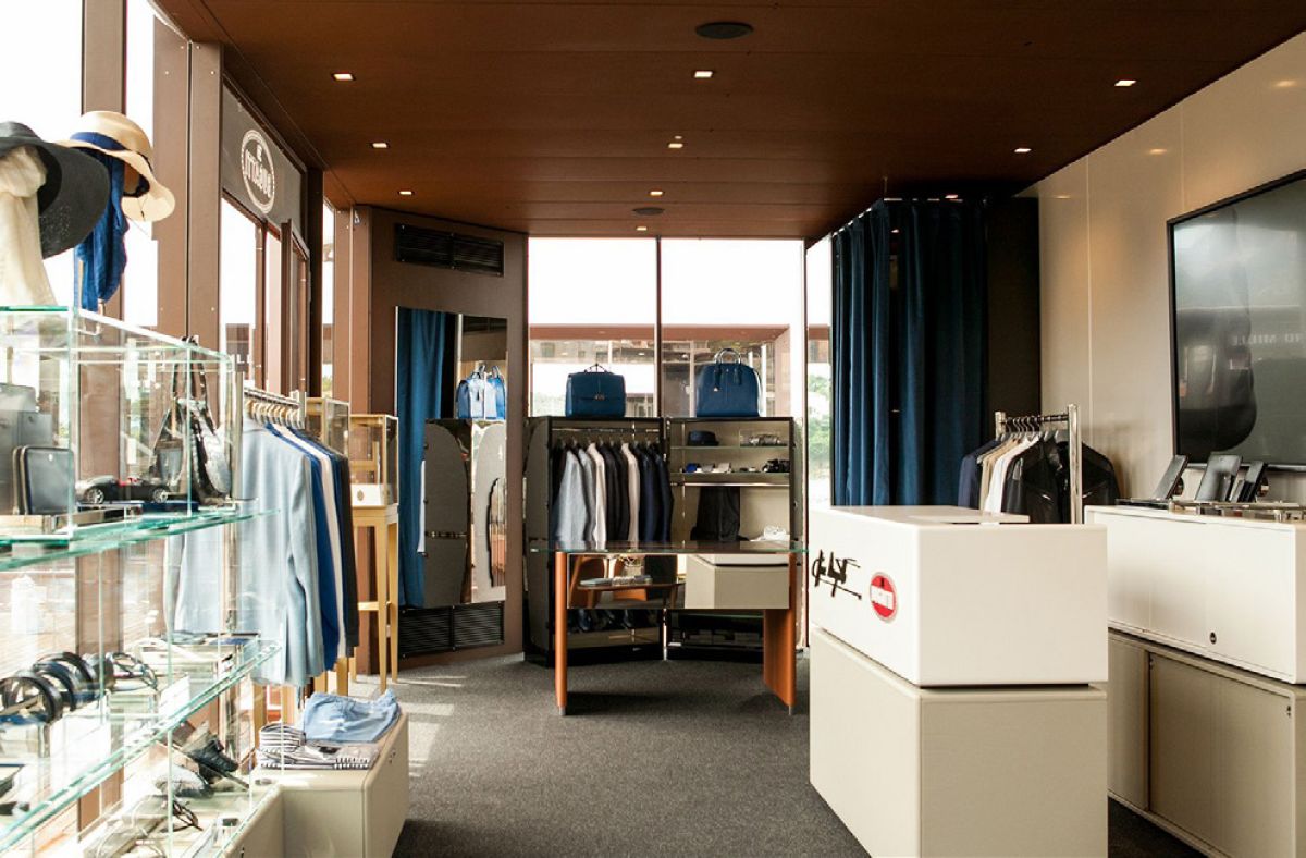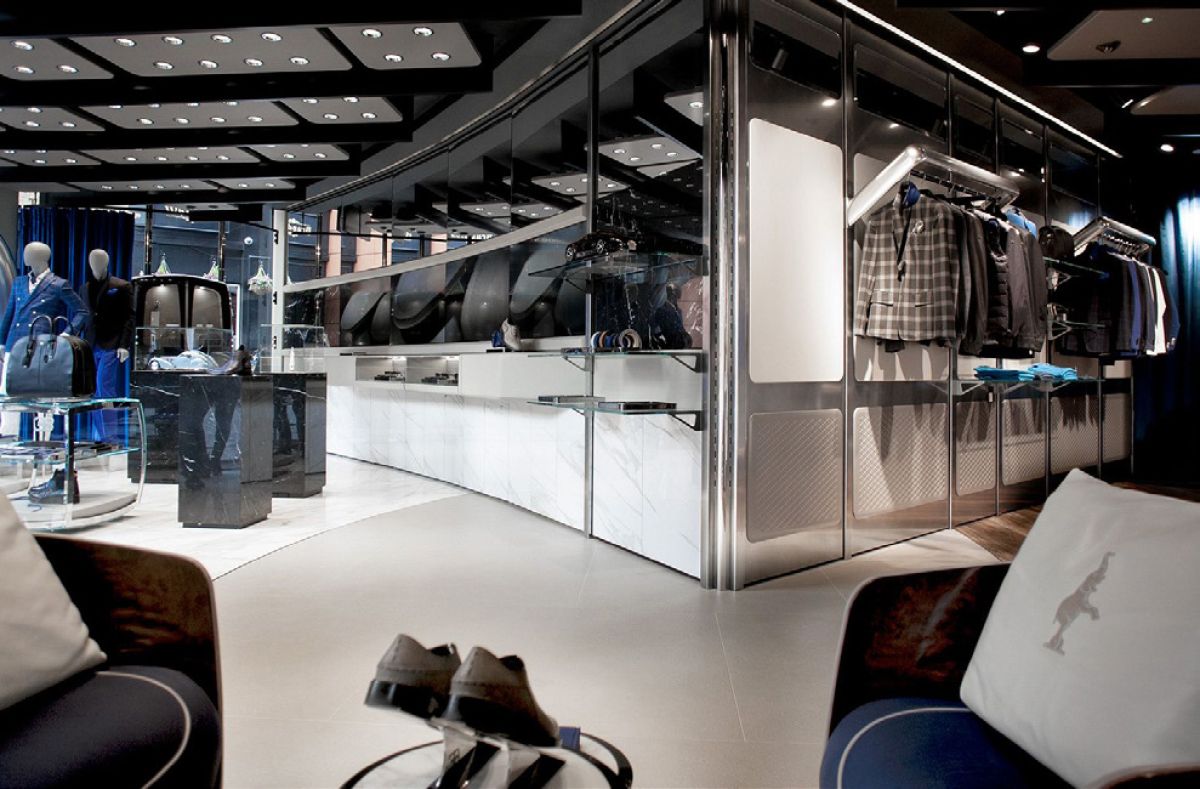 Legno scuro vengo, intonaco effetto cemento, Metallo nero opaco, tessuto velvet in tonalità petrolio per le corner lounge centrali