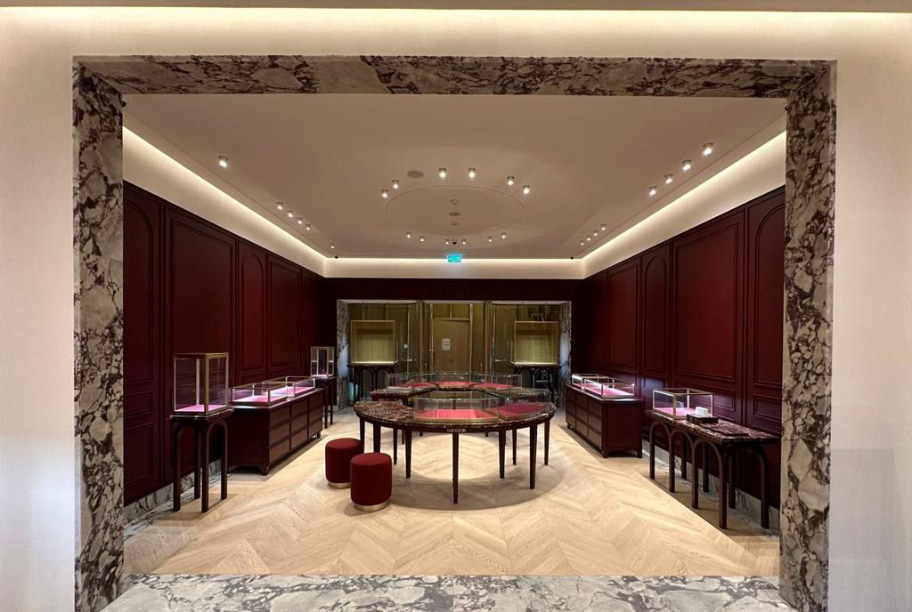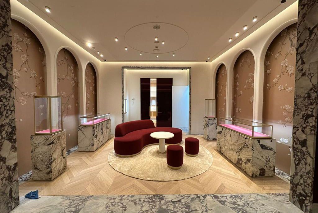 Legno scuro vengo, intonaco effetto cemento, Metallo nero opaco, tessuto velvet in tonalità petrolio per le corner lounge centrali