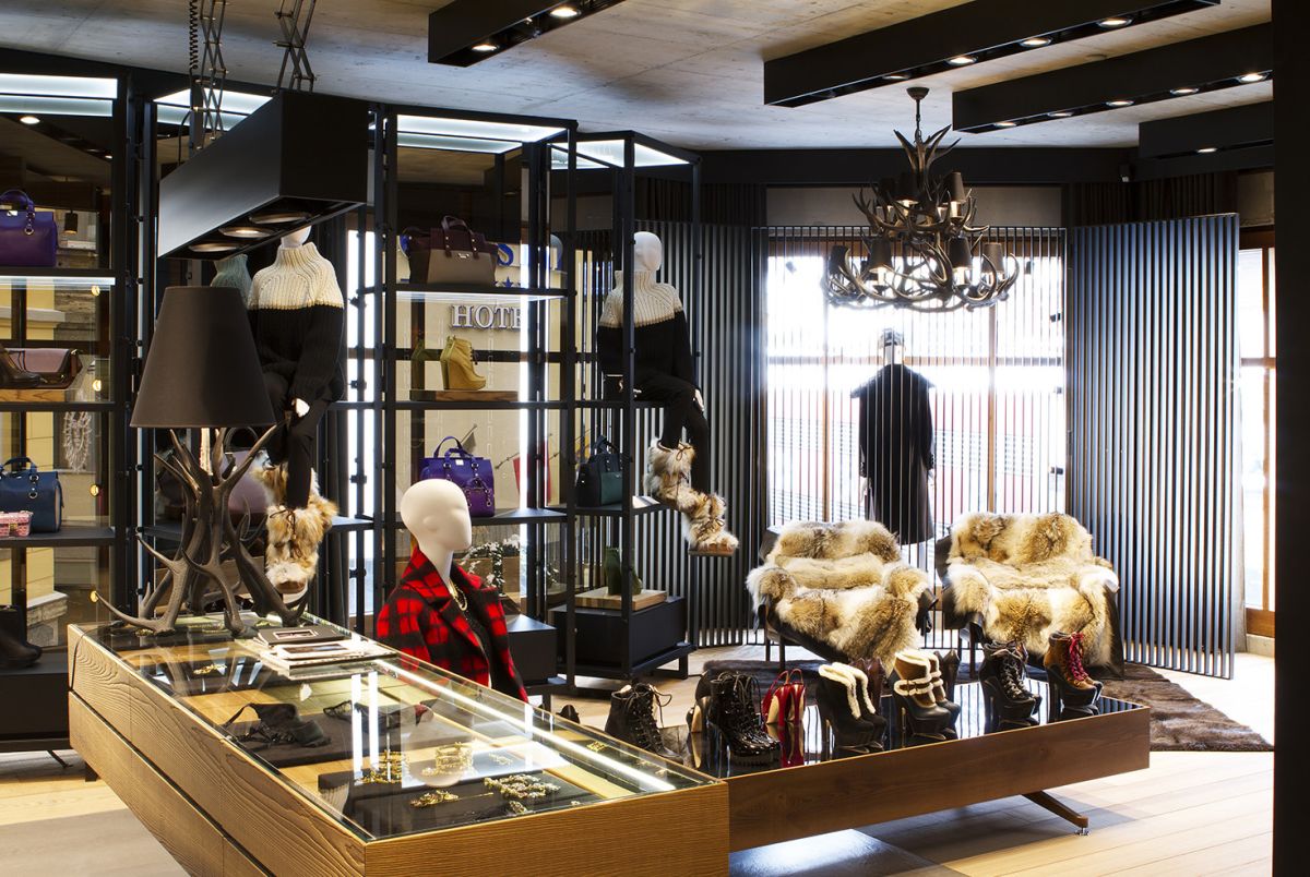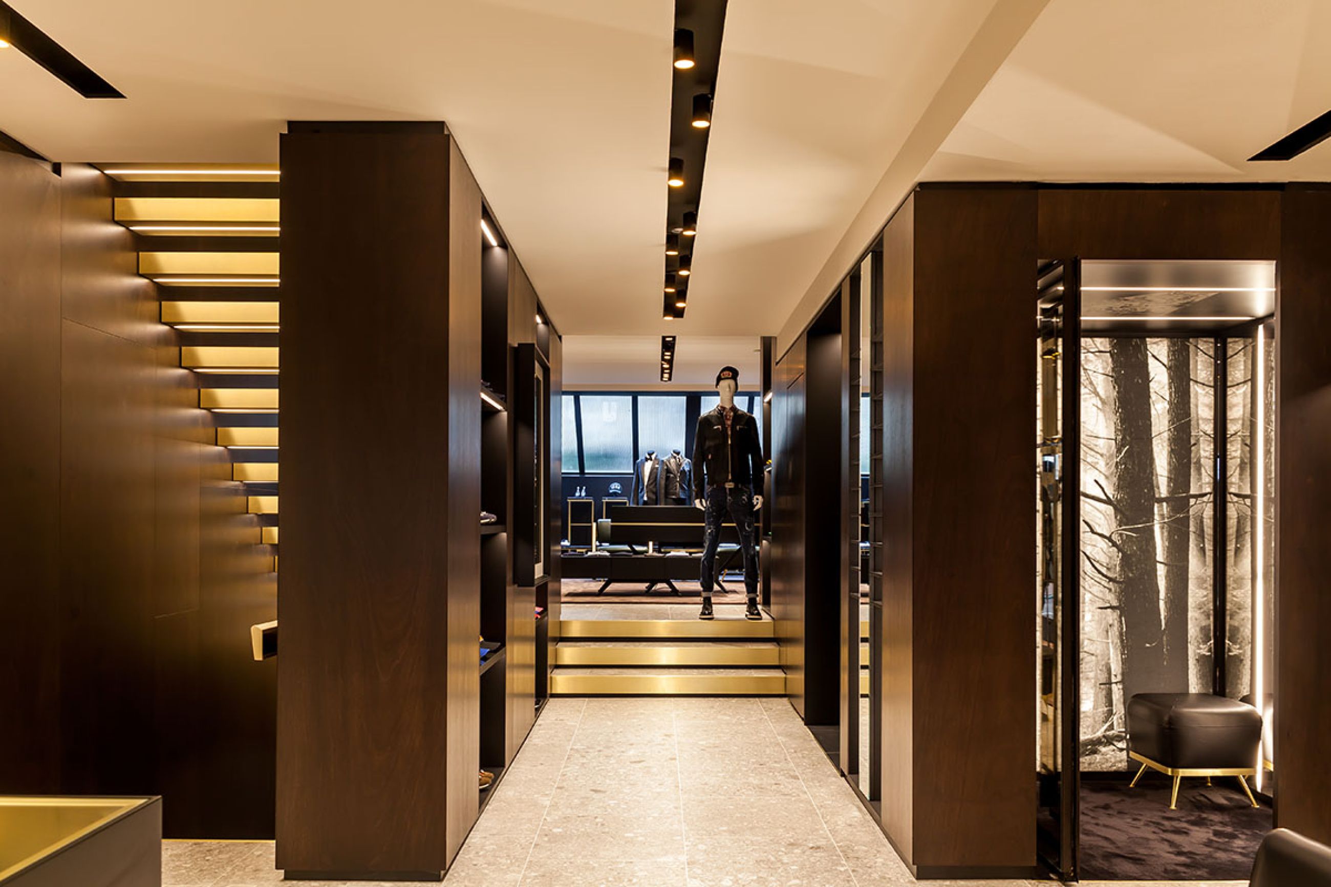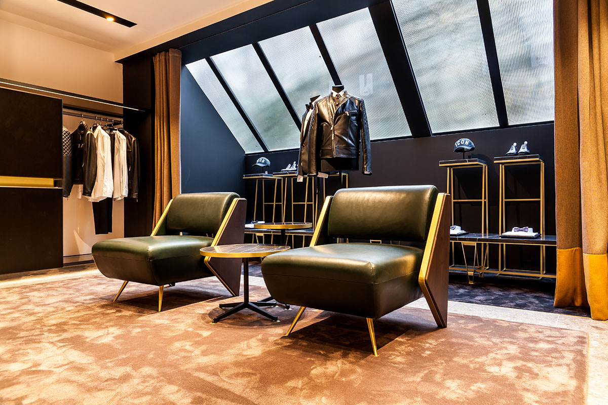 Legno scuro vengo, intonaco effetto cemento, Metallo nero opaco, tessuto velvet in tonalità petrolio per le corner lounge centrali