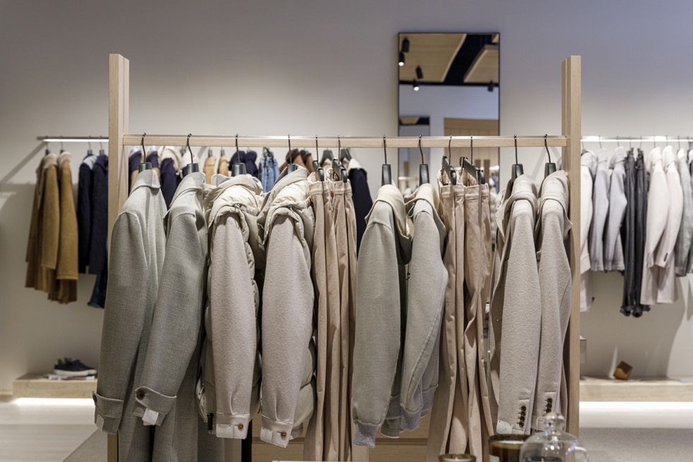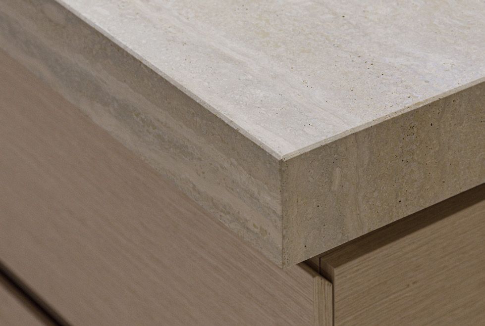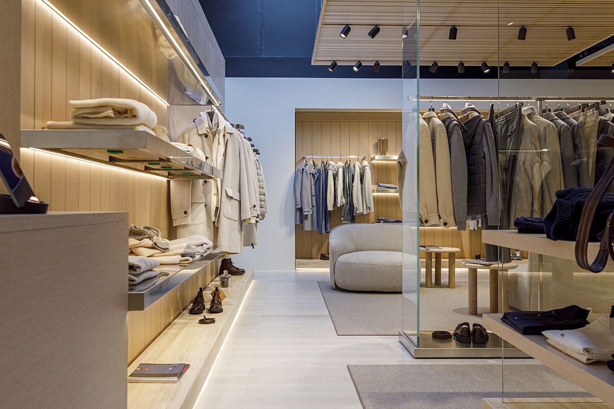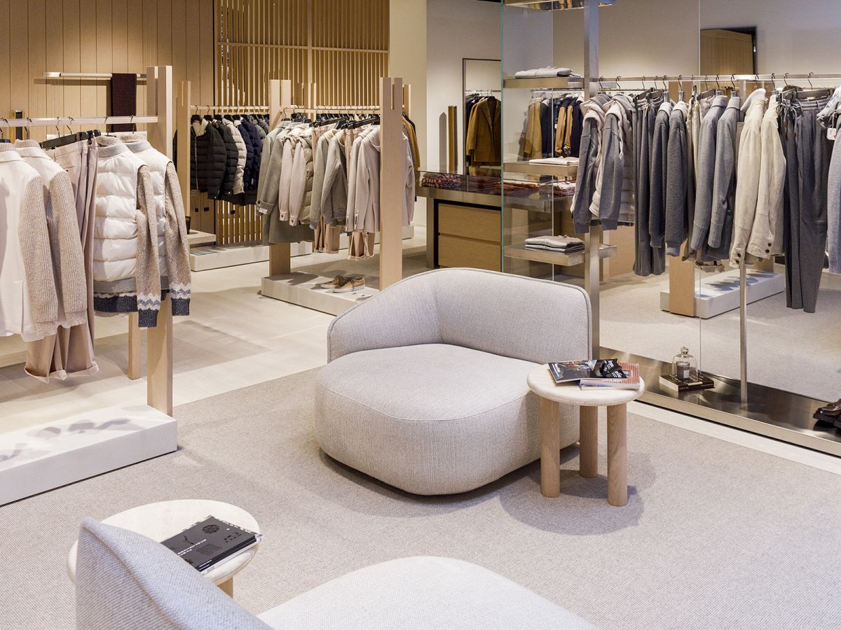 Legno scuro vengo, intonaco effetto cemento, Metallo nero opaco, tessuto velvet in tonalità petrolio per le corner lounge centrali