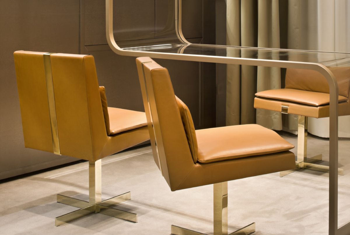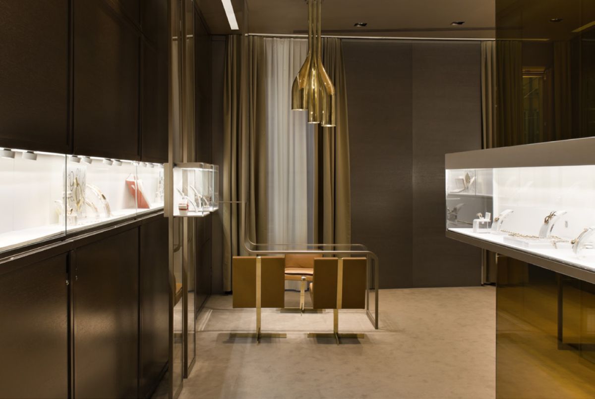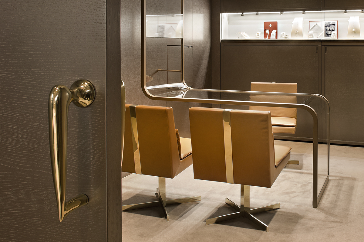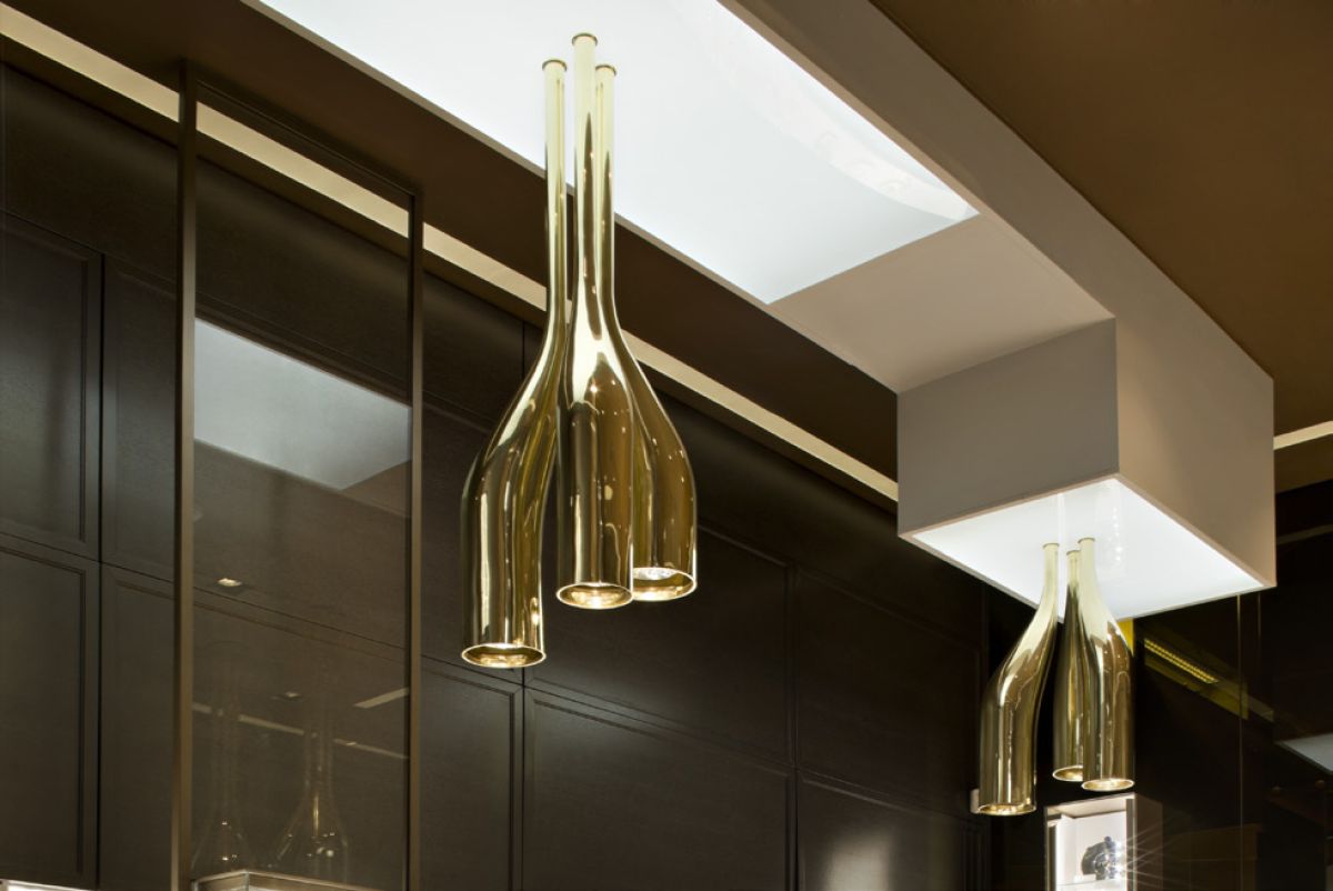 Legno scuro vengo, intonaco effetto cemento, Metallo nero opaco, tessuto velvet in tonalità petrolio per le corner lounge centrali