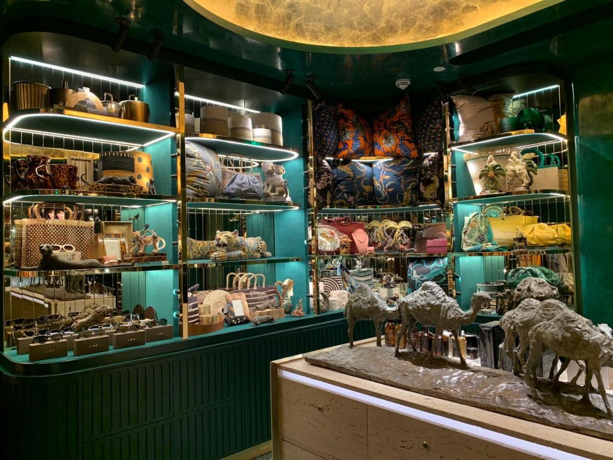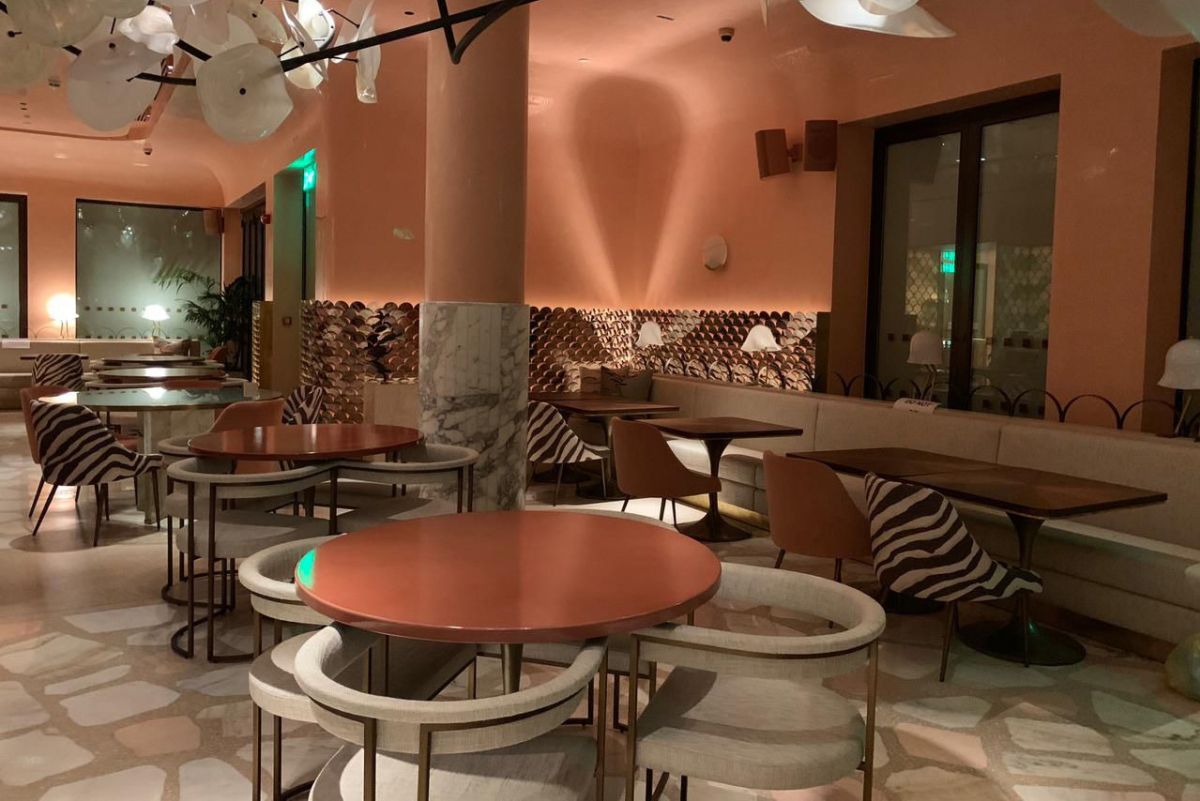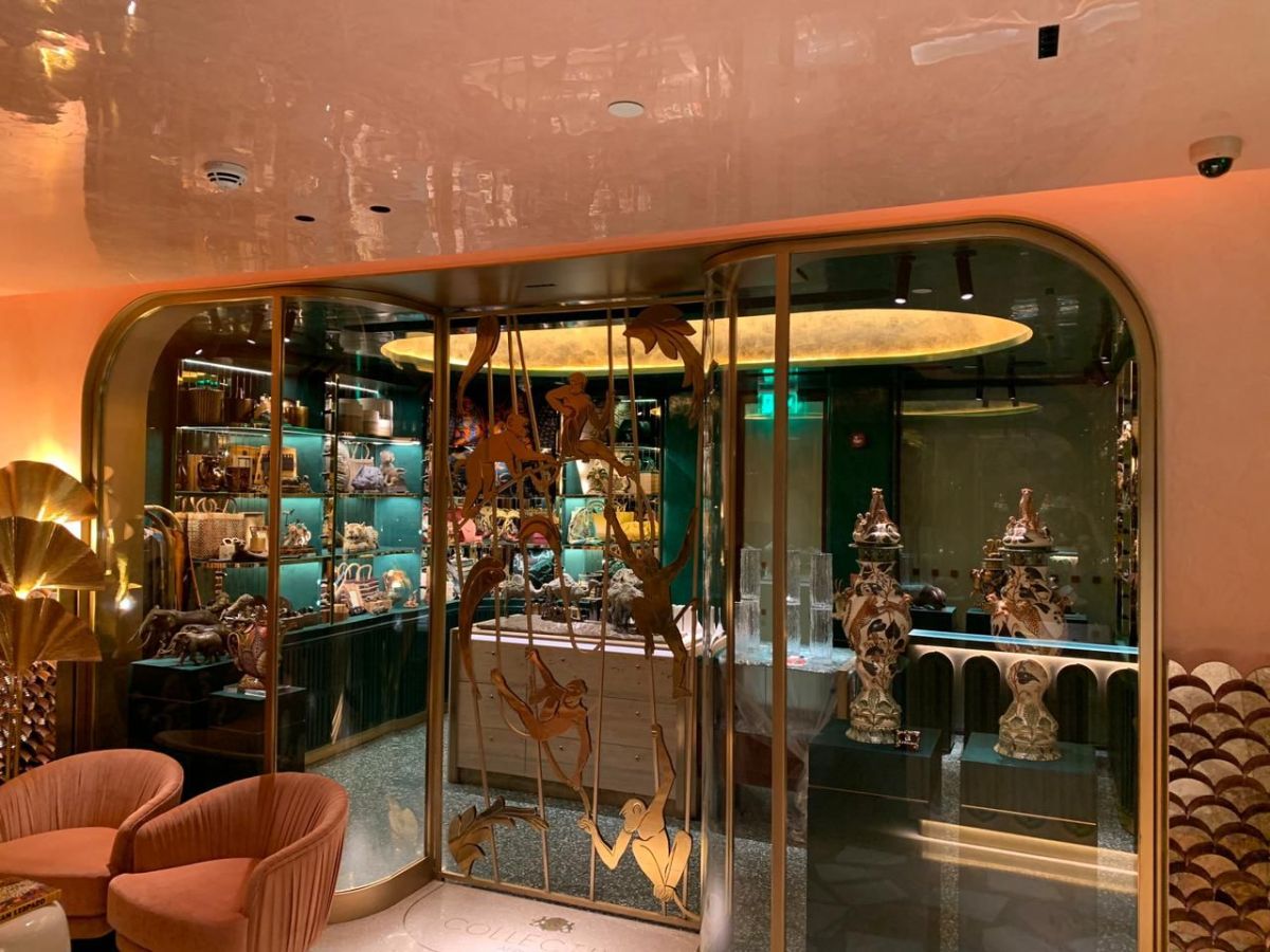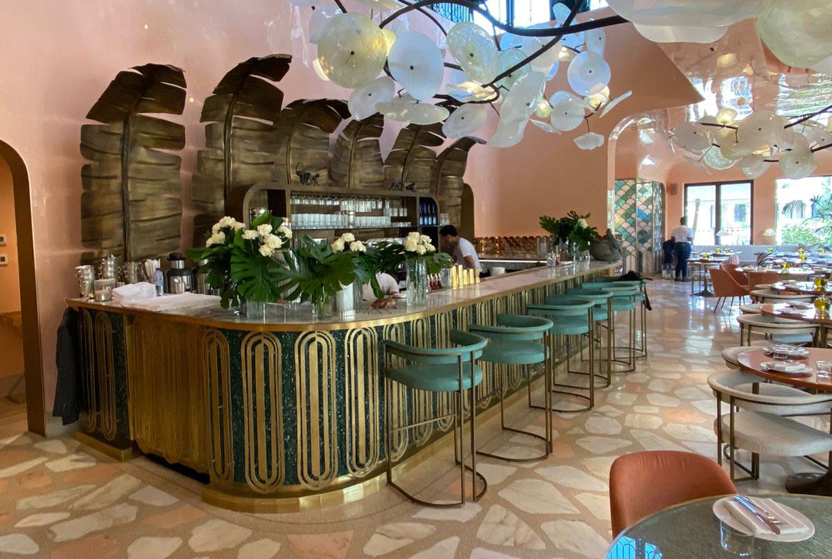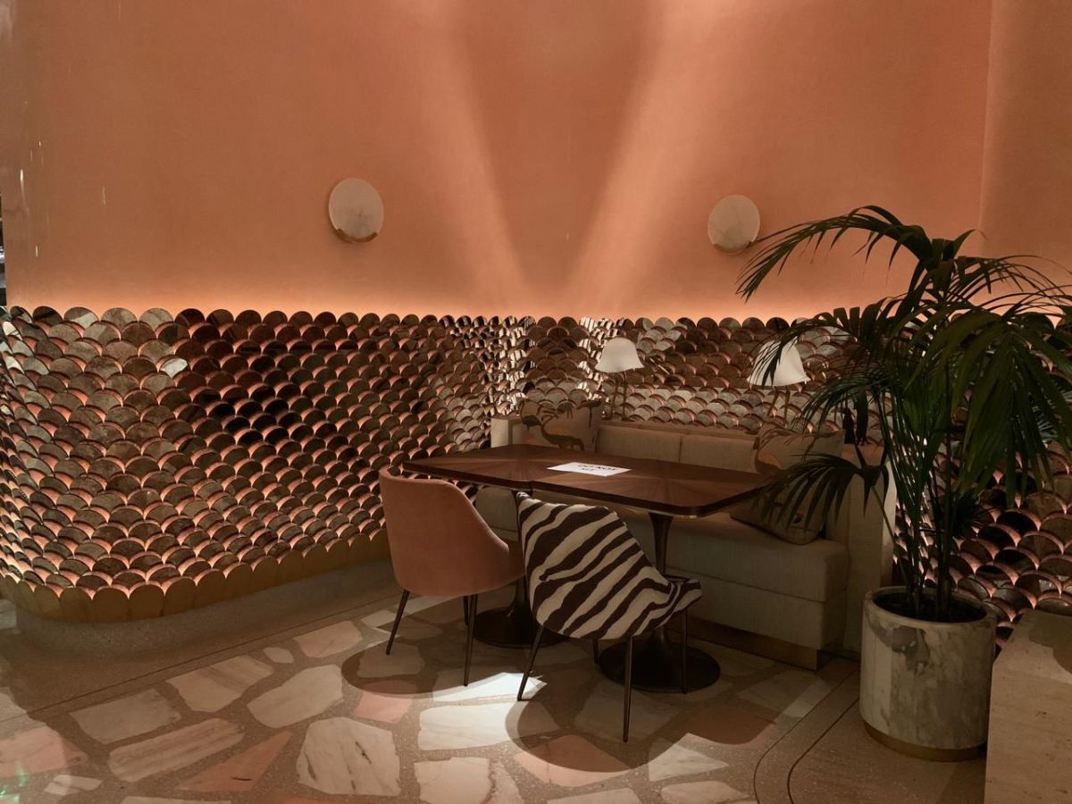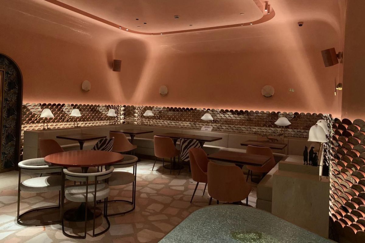Legno scuro vengo, intonaco effetto cemento, Metallo nero opaco, tessuto velvet in tonalità petrolio per le corner lounge centrali