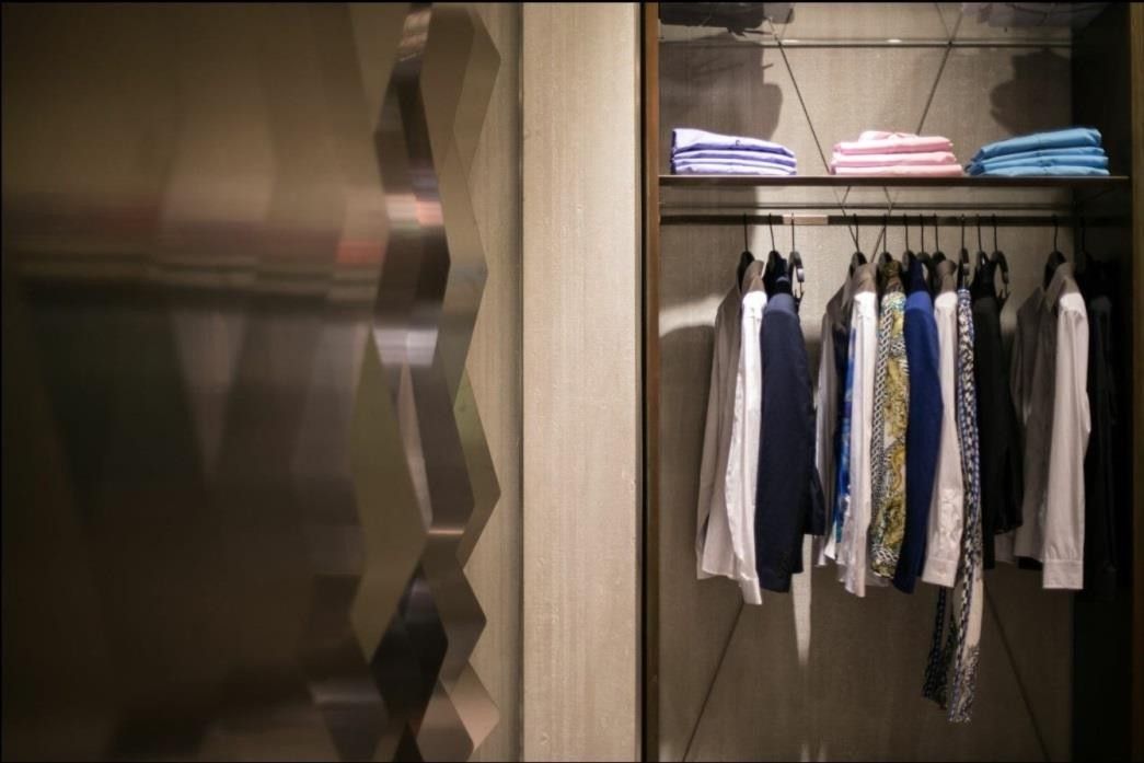 Legno scuro vengo, intonaco effetto cemento, Metallo nero opaco, tessuto velvet in tonalità petrolio per le corner lounge centrali