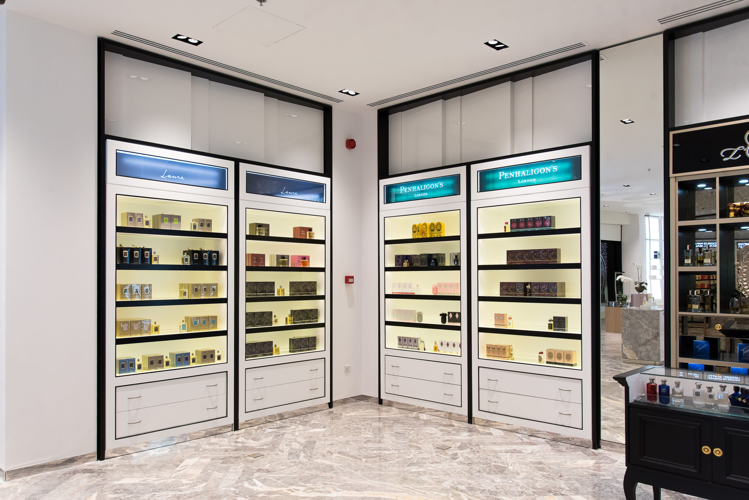Legno scuro vengo, intonaco effetto cemento, Metallo nero opaco, tessuto velvet in tonalità petrolio per le corner lounge centrali