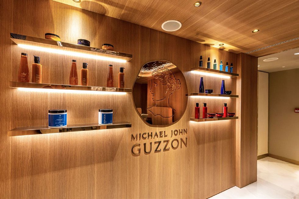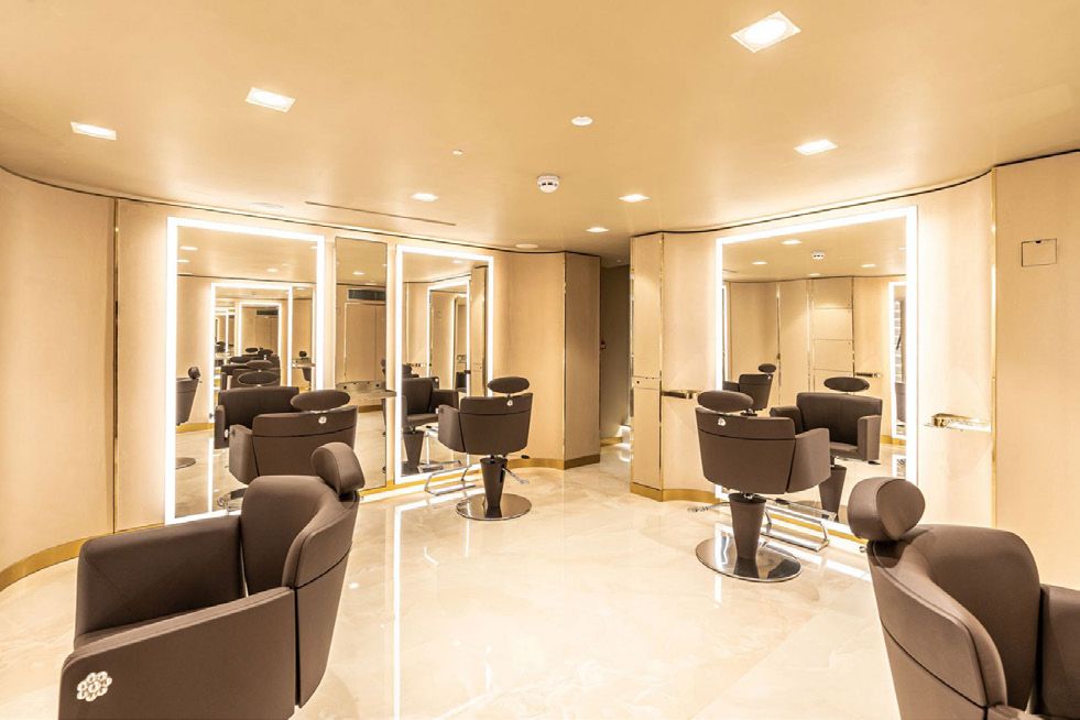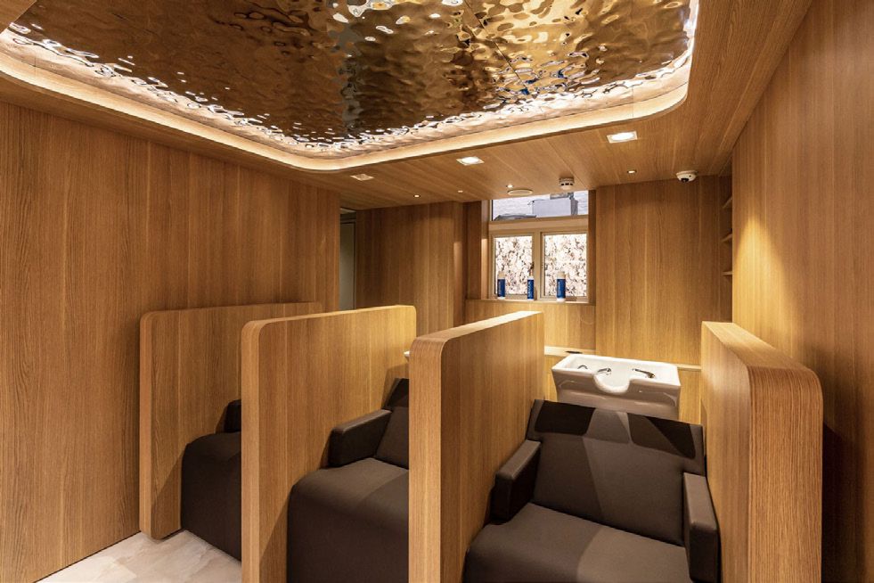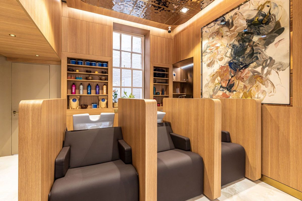 Legno scuro vengo, intonaco effetto cemento, Metallo nero opaco, tessuto velvet in tonalità petrolio per le corner lounge centrali