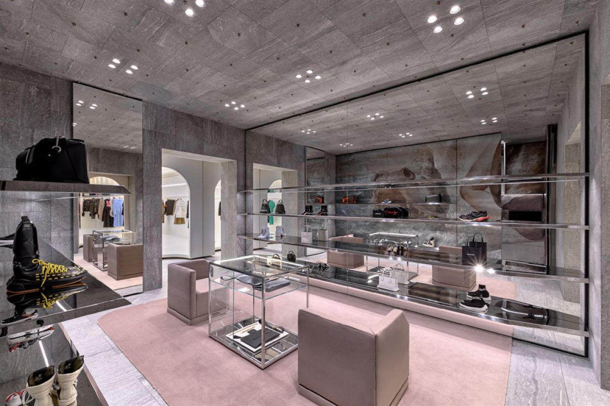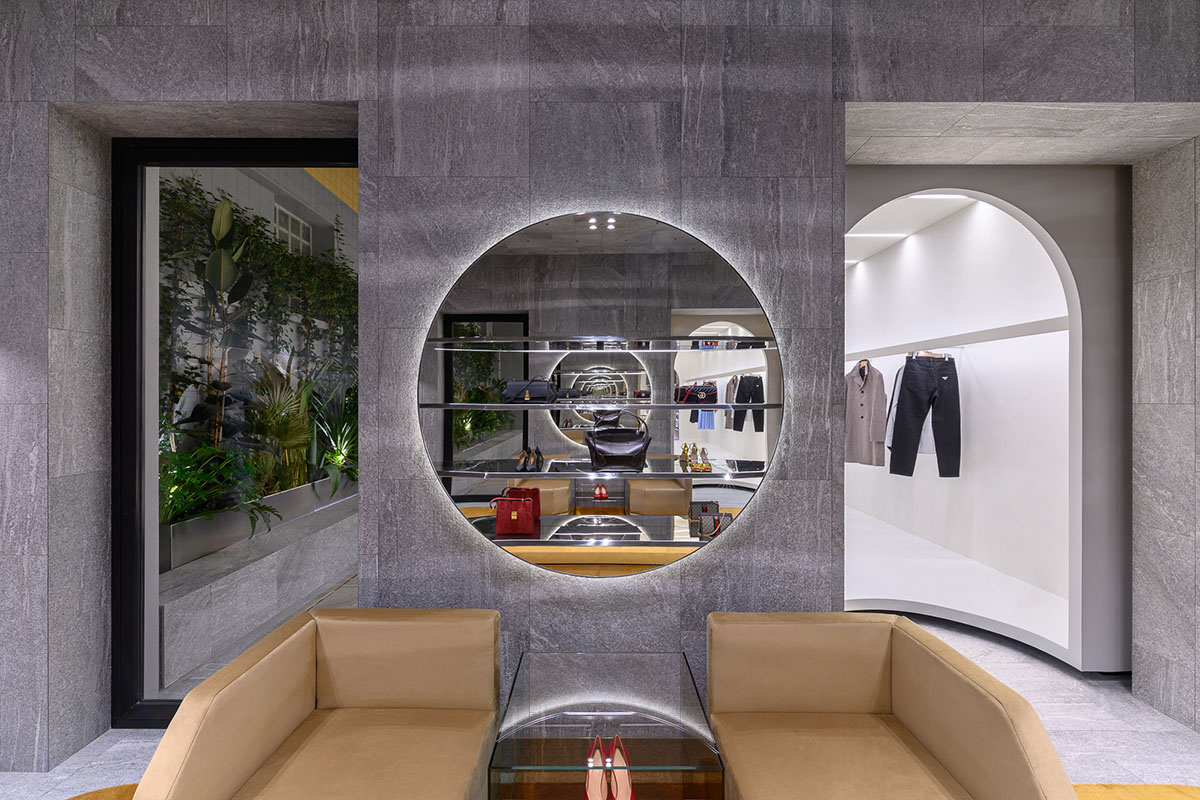 Legno scuro vengo, intonaco effetto cemento, Metallo nero opaco, tessuto velvet in tonalità petrolio per le corner lounge centrali