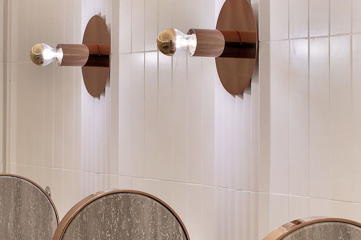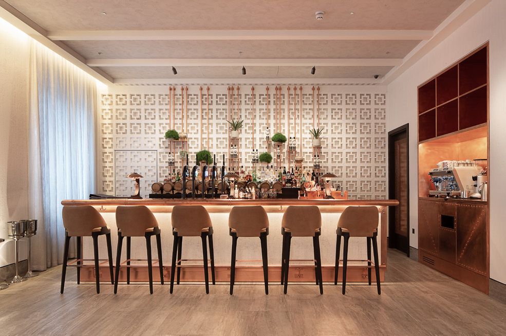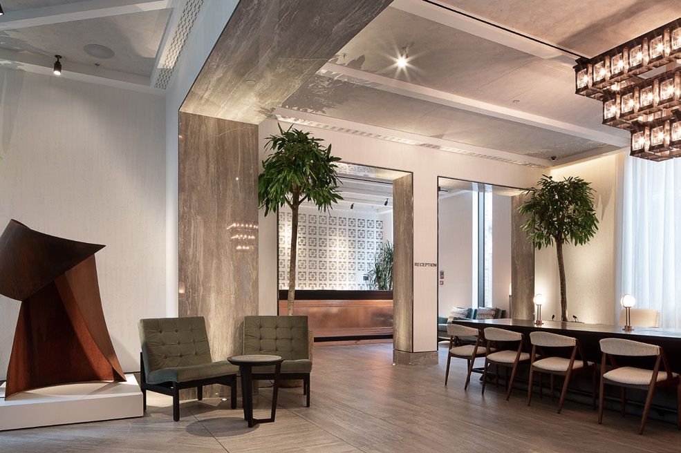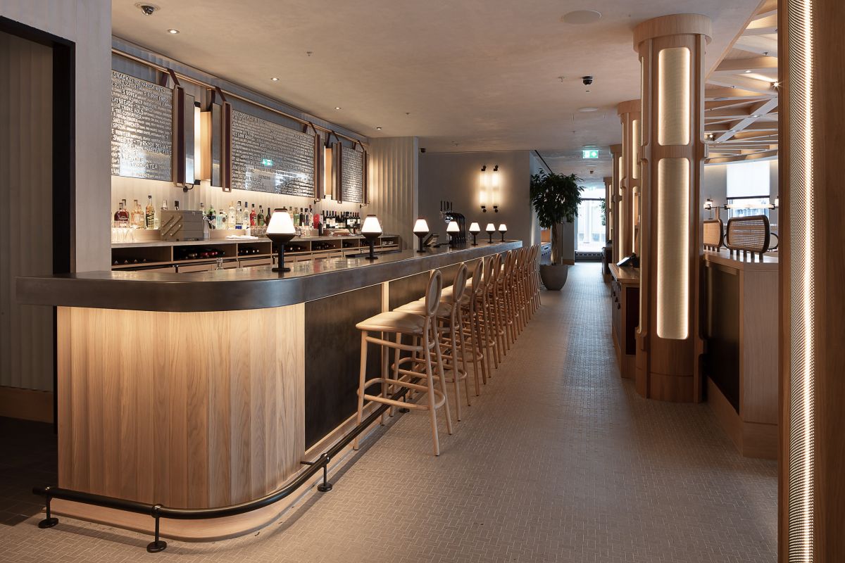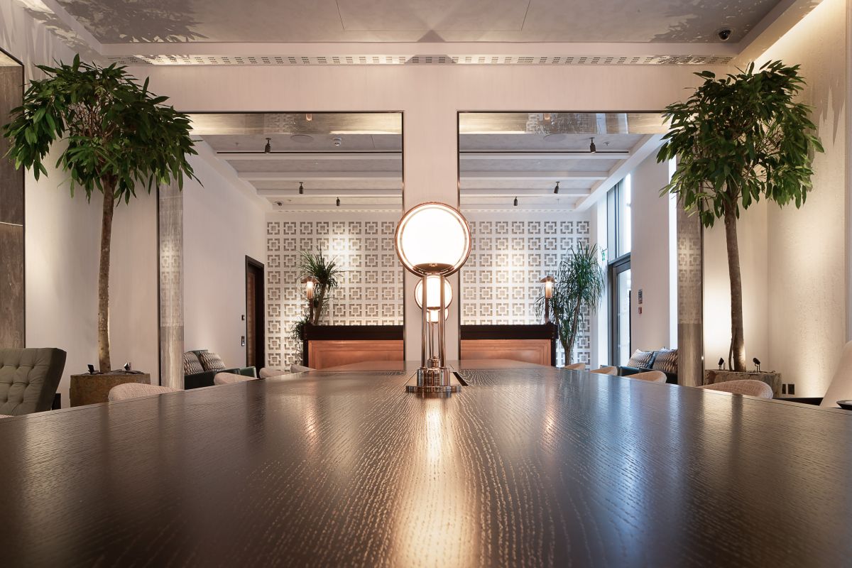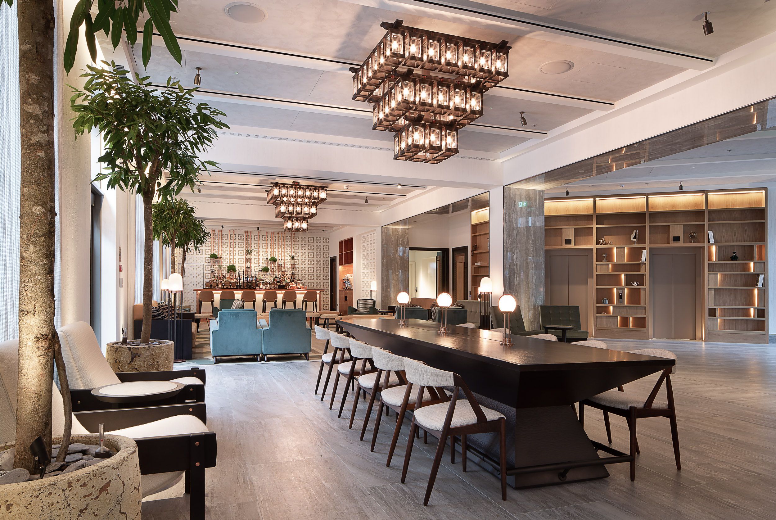 Legno scuro vengo, intonaco effetto cemento, Metallo nero opaco, tessuto velvet in tonalità petrolio per le corner lounge centrali