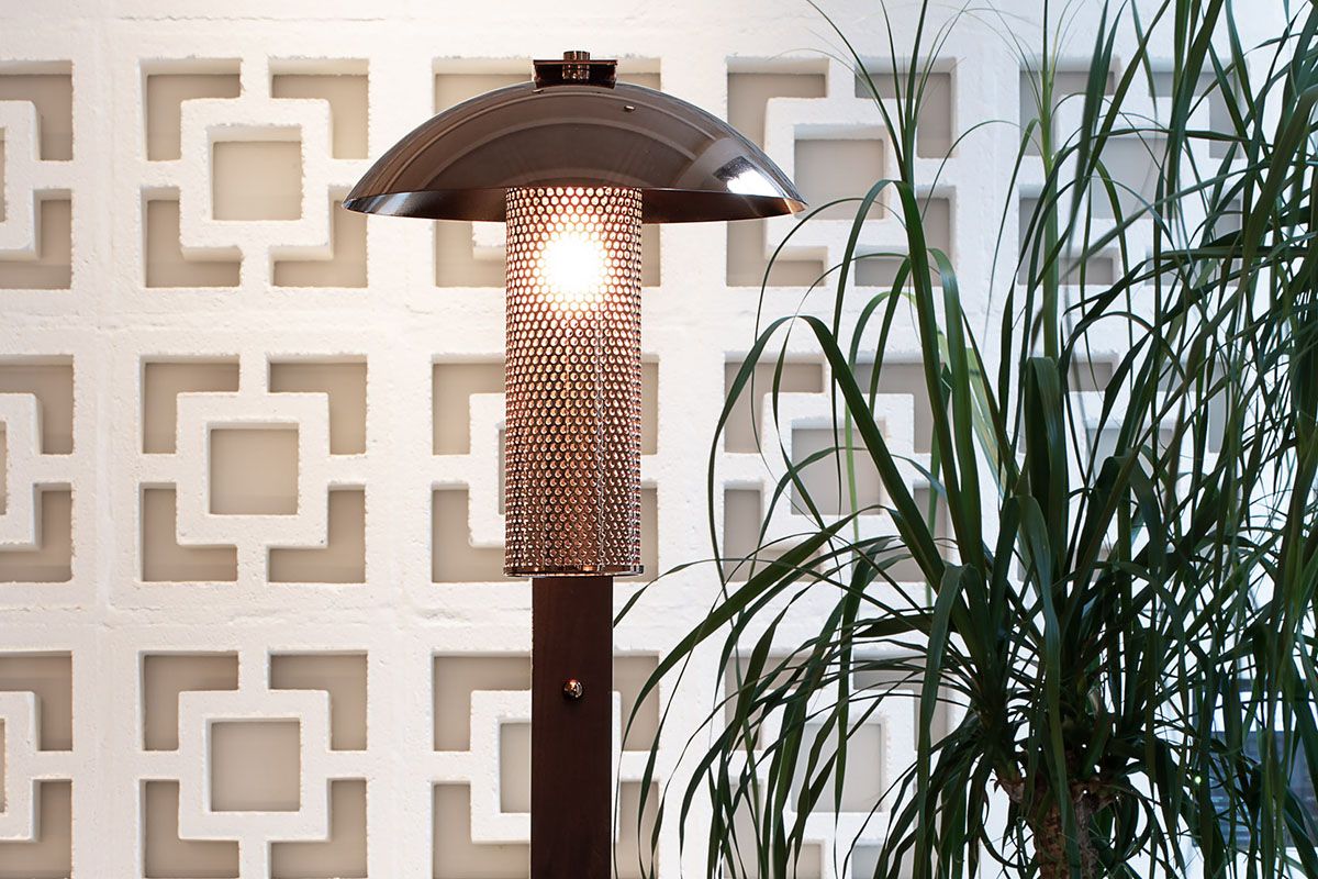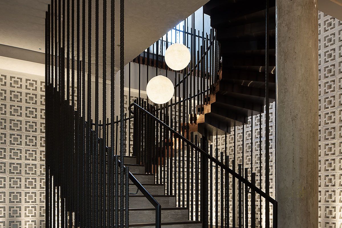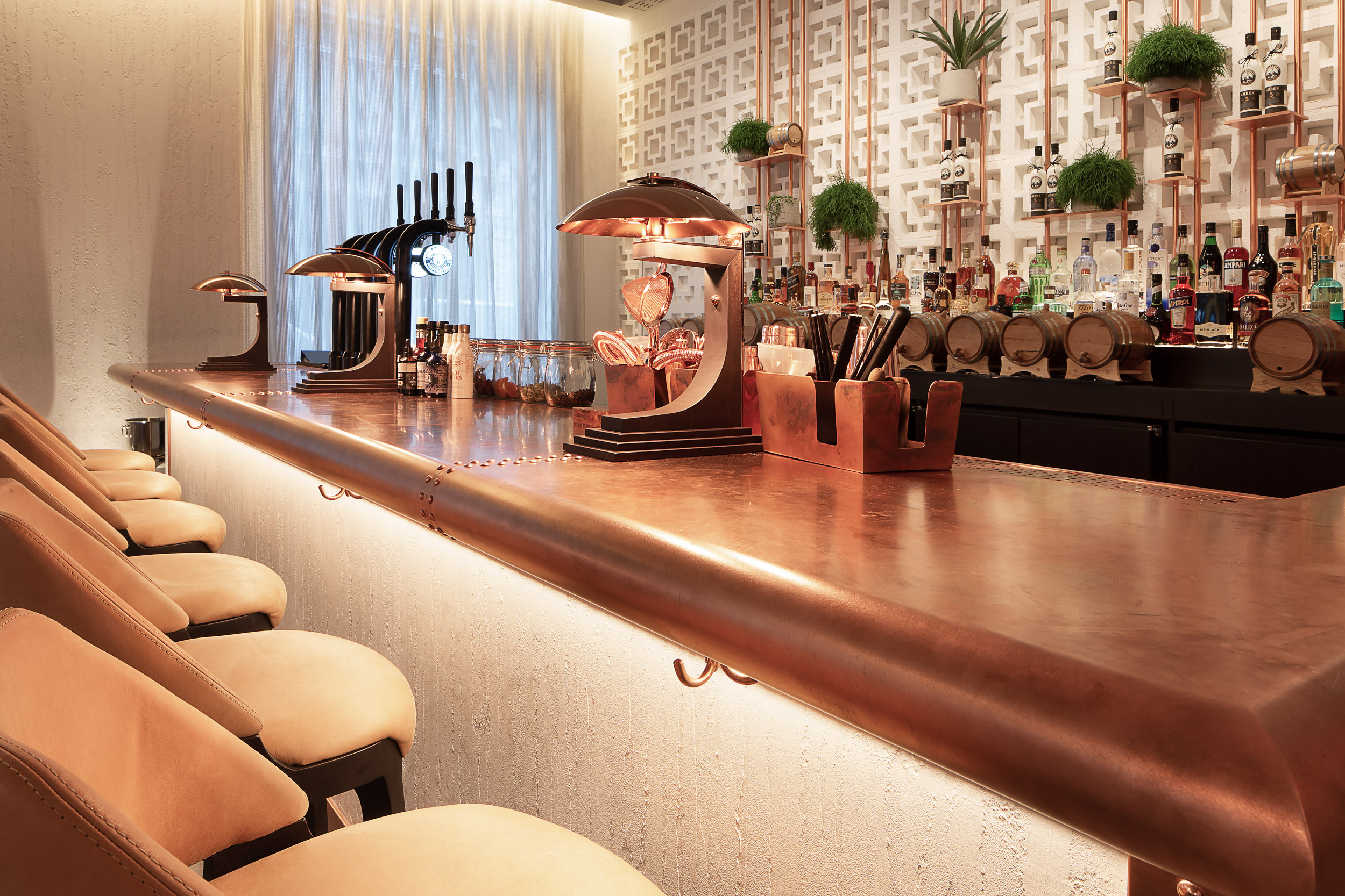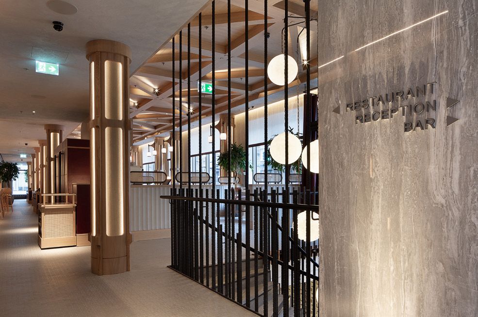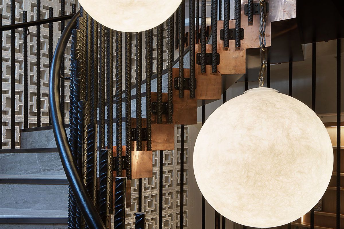 Legno scuro vengo, intonaco effetto cemento, Metallo nero opaco, tessuto velvet in tonalità petrolio per le corner lounge centrali